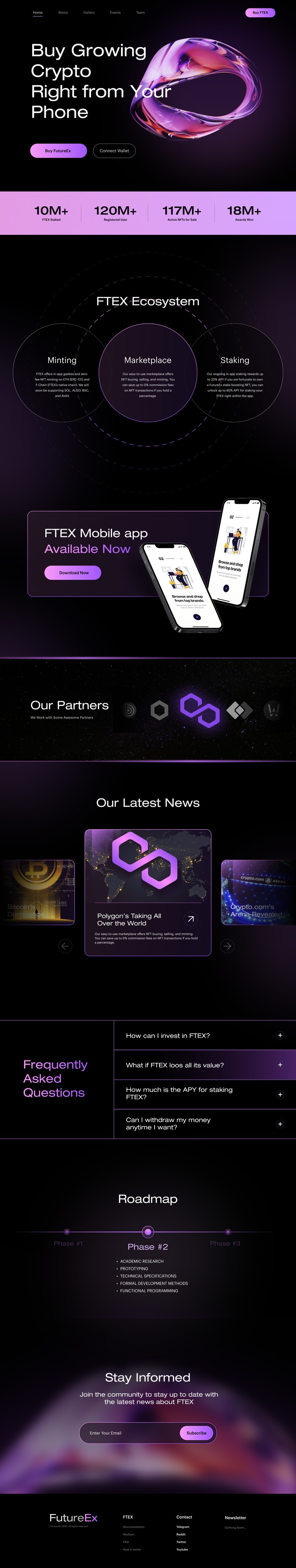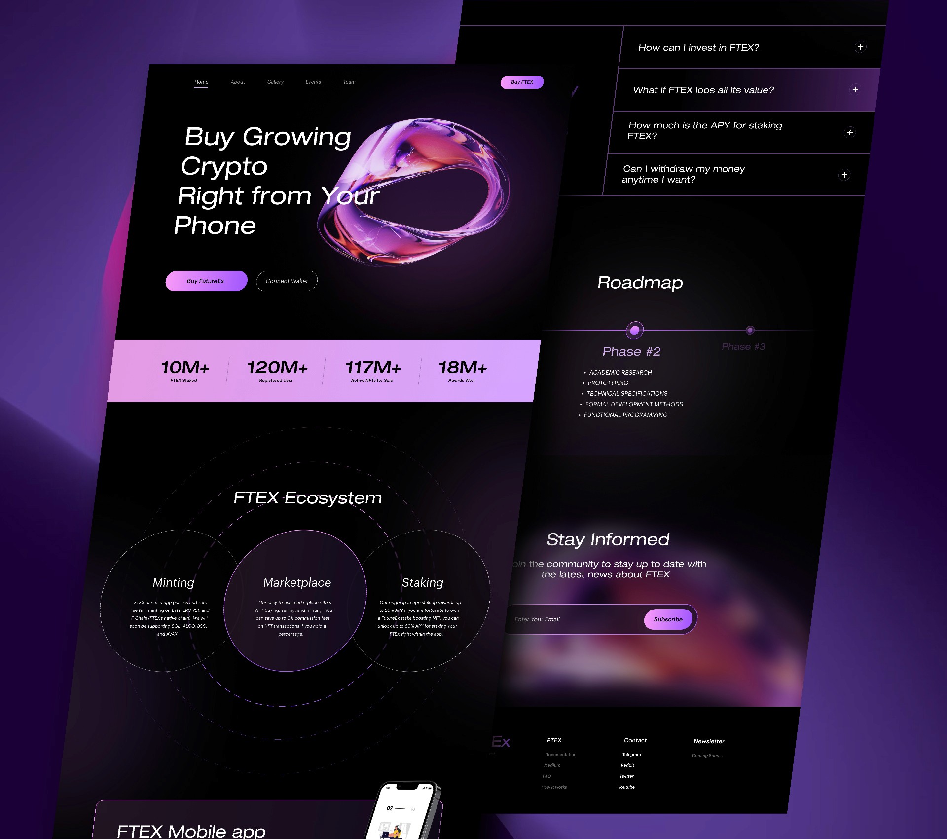 As the UI designer for the FTEX website, a platform revolutionizes the NFT landscape with a user-centric approach. My design ethos emphasizes simplicity, accessibility, and seamless functionality to empower users of all levels. With a clean and modern aesthetic, our intuitive interface facilitates effortless navigation and engagement with key features like NFT minting, marketplace transactions, and staking rewards. We prioritize accessibility, ensuring inclusivity for all users. My design seamlessly integrates with the powerful functionality of the FTEX Ecosystem, offering a streamlined and enjoyable NFT experience. In summary, My UI design embodies innovation, usability, and user empowerment, setting a new standard for NFT platforms.
